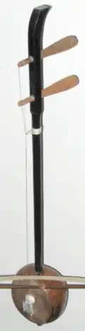 The yehu (Chinese: 椰胡; pinyin: yēhú) is a bowed string instrument in the huqin family of Chinese musical instruments.[1][2] Ye means coconut and hu is short for huqin.[3] It is used particularly in the southern coastal provinces of China and in Taiwan. The instrument's soundbox is made from a coconut shell, which is cut on the playing end and covered with a piece of coconut wood instead of the snakeskin commonly used on other huqin instruments such as the erhu or gaohu. As with most huqin the bow hair passes in between the two strings. Many players prefer to use silk strings rather than the more modern steel strings generally used for the erhu, giving the instrument a distinctly hollow, throaty timbre. The instrument comes in various sizes. In Chaozhou music (where it is called pahi, 冇弦) it is a leading instrument, and is tuned quite high. In Cantonese music it can be quite large and is often tuned to a relatively low pitch, lower than the erhu (usually one octave below the gaohu). It is used as an accompaniment instrument in the local musics and operas of various areas, including Guangdong, Fujian, and Taiwan. It is an important instrument in the music of the Chaozhou and Hakka peoples. In Taiwan, a variety of yehu used in Taiwan opera is called kezaixian.