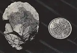 - ^ The axe head was actually found on a gravel bed, under an old flagstone path that lay just below the turf. Recollections of HBS, 3 Apr 2021.