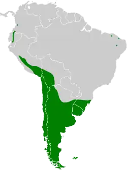 The range includes much of South America, the Falkland Islands, and South Georgia. The nominate and smallest subspecies, the South Georgia pintail A. g. georgica, is thought to number between 1000 and 1500 pairs and is found only in South Georgia. The Chilean, or brown, pintail A. g. spinicauda is widespread on the South American mainland from extreme southern Colombia southwards, as well as in the Falkland Islands, and numbers well over 110,000. Niceforo's pintail A. g. niceforoi, formerly found in central Colombia, is believed to be extinct, having been last recorded in 1952 (and described only in 1946). Their habitat ranges from high-elevation lakes and marshes to low-elevation lakes and rivers and coasts in open country.[11]