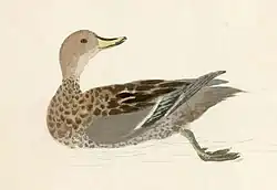 The yellow-billed pintail was formally described in 1789 by the German naturalist Johann Friedrich Gmelin in his revised and expanded edition of Carl Linnaeus's Systema Naturae. He placed it with all the ducks, geese, and swans in the genus Anas and coined the binomial name Anas georgica.[2] Gmelin based his description on the "Georgia duck" that had been described in 1785 by the English ornithologist John Latham in his A General Synopsis of Birds.[3][4] The naturalist Joseph Banks had provided Latham with a water-colour drawing of the duck by Georg Forster who had accompanied James Cook on his second voyage to the Pacific Ocean. The watercolour was painted in 1775 in South Georgia. This picture is now the holotype for the species and is held by the Natural History Museum in London.[5] The genus name Anas is the Latin word for a duck.[6]