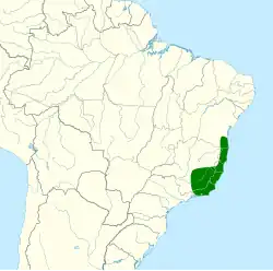 The yellow-eared woodpecker is found in eastern Brazil between the states of Bahia and Rio de Janeiro. It inhabits lowlands and hills of the Atlantic Forest, both primary and secondary, and is also found in parks.[7]