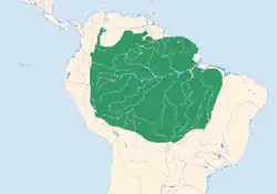 The yellow-tufted woodpecker is native to northern South America. Its range includes eastern Colombia, western and southern Venezuela, the Guianas, northern and central Brazil, eastern Ecuador, eastern Peru and eastern Bolivia. Its altitudinal range is from sea level to about 1,200 m (3,900 ft), and even higher in Ecuador. It is a species of open humid forest, both varzea and terra firme forest, and is also found in secondary forest, woodland verges and burnt out areas with isolated standing trees. It is a non-migratory species.[8]