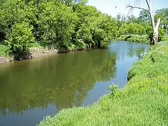 The river's north and south forks each rise in South Dakota on the Coteau des Prairies, a morainic plateau dividing the Mississippi and Missouri River watersheds, and flow across till plains[8] into Minnesota. The north fork issues from Round Lake near South Shore in northeastern Codington County, South Dakota, and flows eastwardly for 57.3 miles (92.2 km)[5] through central Grant County into northwestern Lac qui Parle County, Minnesota. The south fork rises in northwestern Deuel County, South Dakota, approximately six miles (9.7 km) southwest of Strandburg, and flows generally northeastwardly for 56.4 miles (90.7 km)[5] through southern Grant County and western Lac qui Parle County, passing near the community of Nassau, Minnesota. From the confluence of the forks in Yellow Bank Township, Minnesota, the Yellow Bank River flows northwardly for its short course, passing through the Big Stone National Wildlife Refuge, and entering the Minnesota River in Agassiz Township, approximately 3 miles (5 km) southeast of Odessa.[9] In the Big Stone refuge, the river flows among woodlands of American elm, ash, box elder, and silver maple, and may be fished.[10]