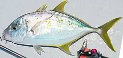 The yellowspotted trevally is a large fish, growing to at least 1.2 m in length and reaching a recorded maximum weight of 18 kg.[5] Its body shape is like the jacks of the genus Caranx, being more elongated and subcylindrical than most of the other species of Carangoides.[6] As a juvenile, the fish is more subovate, becoming more elongated with age, with the dorsal profile of the head and nape becoming steeper with age also.[6] The dorsal fin is in two distinct parts, the first consisting of eight spines, while the second is composed of one spine and 25 to 30 soft rays, with the anterior lobe of this fin being shorter than the head length. The anal fin has two anteriorly detached spines followed by one spine attached to 21 to 26 soft rays and the pelvic fin has one spine and 18 to 19 soft rays.[7] The lateral line has a gentle anterior arch, which is slightly longer than the straight section of the lateral line, with the intersection below the 13th to 16th soft ray of the dorsal fin. The curved section contains 80 to 88 scales, while the straight section consists of 12 to 17 scales and 26 to 31 scutes.[7] The breast is scaleless until the origin of the pelvic fins and up to the origin of the pectoral fins, although some individuals have a narrow band of scales separating the pectoral fins. In adults, the mouth cleft is directly beneath the eye, with the both jaws containing bands of villiform teeth. It has 22 to 27 gill rakers in total and 24 vertebrae.[6]