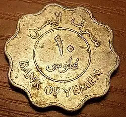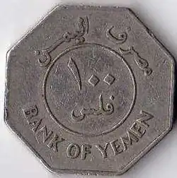 In 1971, coins were issued in the name of "Democratic Yemen", changing to the "People's Democratic Republic of Yemen" in 1973. That year, aluminium 2+1⁄2 fils were introduced, followed by aluminium 10 fils and cupro-nickel 100 and 250 fils in 1981. The 10 fils was scalloped shaped whilst the 100 fils was octagonal.
