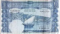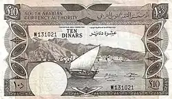 On 1 April 1965, the South Arabian Currency Authority introduced notes in denominations of 250 fils, 500 fils, 1 dinar, and 5 dinars. A 10 dinar note was issued on 1 July 1967.[1]