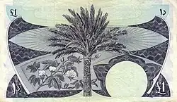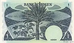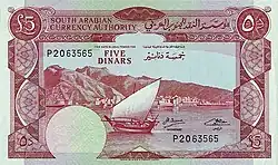 5 dinars | Pink | Dhow boat with Port of Aden in background | Date palm, millet and cotton | ||