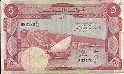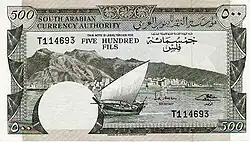 In 1984, the Bank of Yemen introduced 500 fils as well as 1 dinar, 5 dinar, and 10 dinar notes that are like the preceding issues of South Arabia, except the English text and printer's imprint have been removed from the front, the name of the issuer has changed and now appears on the back, along with the name of the capital (ADEN).[2]