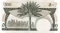 500 fils | Green | Dhow boat with Port of Aden in background | Date palm, wheat | ||