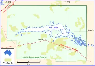 Yeo Lake is an ephemeral salt lake in the south of Western Australia, lying in the Great Victoria Desert east of Cosmo Newberry.[1] The Anne Beadell Highway runs along its southern margin, and the Great Central Road lies further to its north. Its surface elevation is 349 metres above mean sea-level.[2]