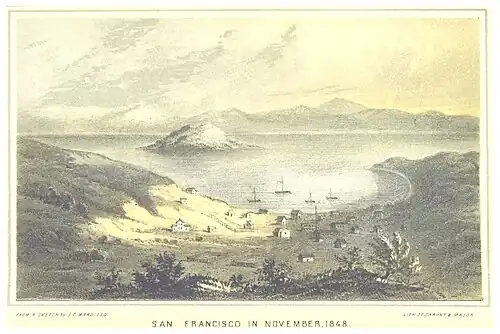 There were several anchorage spots for ships visiting San Francisco. The earliest one was the Presidio anchorage, located just inside the Golden Gate, within a mile to the east of Punta del Cantil Blanco (what was later called Fort Point). The Yerba Buena anchorage eventually came to be more favored, as it was more sheltered and less precarious than the Presidio anchorage, even though it was farther from the Presidio headquarters. The Yerba Buena anchorage actually referred to two locations, with the earlier spot being close to North Point, but was later located a little further to the south, at Yerba Buena Cove.[4] The name was eventually extended to the island facing Yerba Buena Cove, the Isla de Yerba Buena (Yerba Buena Island), originally known as Isla de Alcatraces.