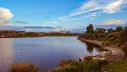 The Yerevan Lake is located on the territory of the former village of Nor Koghb, the population of which was resettled to another district in Yerevan. If the water level is lowered the remains of the old bridge of Nor Koghb connecting the two banks of the Hrazdan river that can still be seen in the bottom of the reservoir.[3] Traces of the ancient Umeshin Canal, the famous Urartian canal built in the 7th century BC by the Urartian king Rusa II (685-645 BC) that irrigated the gardens of Echmiadzin and Zvartnots, also remain under the lake.[4]