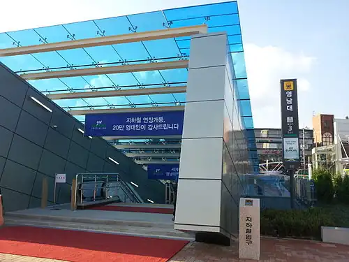Yeungnam University Station (Korean: 영남대역; Hanja: 嶺南大驛; RR: Yeungnamdae-yeok) is a station of Daegu Metro Line 2 in Dae-dong, Gyeongsan, North Gyeongsang Province, South Korea.