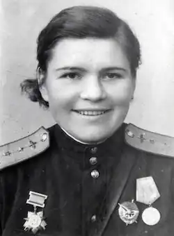 Yevgeniya Dmitrievna Timofeeva (Russian: Евгения Дмитриевна Тимофеева; 23 December 1911 – 13 June 1992) was a pilot in the Soviet Air Force and the first woman to fly the Pe-2. As a member of the 587th Bomber Aviation Regiment, later redesignated as the 125th Guards Bomber Aviation Regiment named after Marina Raskova, she initially served as a squadron commander but was later promoted to deputy regimental commander during the war. By the end of the war she totaled 45 sorties on the Pe-2.[1][2][3][4][5]