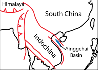 Yinggehai basin is lies at the southern end of the Red River fault zone, located at the Gulf of Tonkin. The tectonic origin of Yinggehai basin is controversial.[3] However, it is generally agreed that the basin is opened by the southeastward slip and clockwise rotation of the Indochina block along the Red River fault zone,[4] and that the basin is formed by deformation related to the strike-slip tectonism. The evidence includes the northwest–southeast elongation of the basin, its location at the southern end of the Red River fault zone, and that the basin is bounded by steep faults developed parallel to the Red River fault. What is not agreed is how much motion that has been along the Red River fault during the opening of the basin.