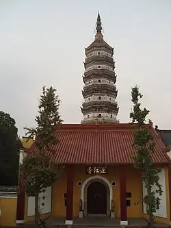The Zhenfeng Pagoda (振风塔) was originally built in the Song dynasty (960–1279) and reconstructed in 1570 in the reign of Longqing Emperor (1567–1572) of the Ming dynasty (1368–1644). It initially called "Ten Thousand Buddha Pagoda" (万佛塔). The 64.8-metre-high (213 ft) pagoda has the brick-and-wood structure with seven storeys and eight sides. Curved bars and cornices are set on each story, which are magnificent and become the symbol of Yingjiang Temple. Over 1,200 statues of Buddha are enshrined in its interior.[2][1]