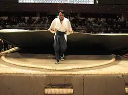 Other tasks on match days include: sweeping the ring, providing purification salt, handing towels to wrestlers, displaying banners showing that a match has been decided by default (usually due to a competitor's withdrawal), or subject to a rematch after the next two bouts, and ensuring that, during a bout, no wrestler injures himself on the bucket of chikara-mizu (power water) situated at each east and west side of the ring.[15] The yobidashi are also responsible for bringing the thick cushions of the makuuchi-ranked wrestlers to the ring, which are handed to them by the tsukebito (assistant) who come out of the changing rooms.[18] Junior yobidashi also help senior gyōji during the kaobure gonjō ceremony.[19] Less publicly, yobidashi also take care of many small requests made by the Sumo Association executives on judging duty or guard duty in the corridors, such as fetching drinks or cigarettes.[3]