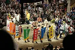 Another recognisable task of the yobidashi is parading the kenshō (advertising) banners around the ring before particular match-ups between popular wrestlers, which are often sponsored by companies.[17] The yobidashi are responsible for banging the taiko drum at different times of the day.[8] Originally, these different times were used to convey different messages to spectators outside the arena. The first drum sound is the ichiban-daiko (一番太鼓), played during the 15 days of the tournaments, for 30 minutes from 8 am to announce the opening of a day of matches. At the end of the day, immediately after the yumitori-shiki (bow-twirling) ceremony, the hane-daiko (跳ね太鼓) is played to invite spectators leaving the arena to disperse.[8] Before the Second World War, the yobidashi took part in the tours separately and by ichimon (clan), therefore the method used to beat the drum was different and these variations are traditionally preserved today, even if all yobidashi now take part in the tours equally.[7] High-ranking yobidashi finally accompany sekitori-ranked wrestlers in their dohyō-iri ring-entering ceremonies by sounding their hyōshigi, an instrument consisting of two pieces of cherry wood tied together with a cord.[10]