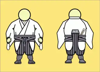The outfit worn by the yobidashi is loosely based on an old style Japanese workman's outfit, with tatsuke-bakama (裁着袴), working trousers, and tabi socks.[20] The kimono worn by the yobidashi often displays sponsors' names in black characters and logo.[11] As there are currently eight main sponsors of the Sumo Association,[21] each yobidashi has eight different kimono which he wears during all 15 days of each basho.[10] The costume is the same for senior and junior ranked yobidashi and only the kimono worn on the torso varies in color and the names on the back. Since the kimono display the logos and names of the sponsors, it is often offered by them and the yobidashi rarely choose the colors of their kimono. Their hakama colors and designs, on the other hand, are often decided within an ichimon, but it can also be presented by rikishi who have been promoted to ōzeki or yokozuna as a commemorative gift and the shikona, or ring name, of the said wrestler can be seen at top of the back of the hakama, in place of the name of the stable to which the yobidashi belongs, which is normally found there.[10][18]