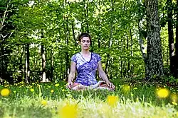 Cleansing asanas are those that when practiced for short periods of time help the body prevent or correct internal imbalances and tone inner organs; while meditative asanas are those postures, either sitting or standing, that one can maintain steadily and comfortably for extended periods of time.[66] In both, a proper posture is achieved when one can combine relaxed steadiness with deep breathing exercises. Such comfortable and stable asanas are necessary for cleansing of the Nadi (Astral Tubes which are around seventy two thousand running throughout the human body) through the Pranayama stage of yoga.[66] This view is shared by other yoga texts, such as in verse 5.2 of Gheranda Samhita.[69] The Padmasana (lotus position) is esteemed for both cleansing and meditative contemplation.[70]