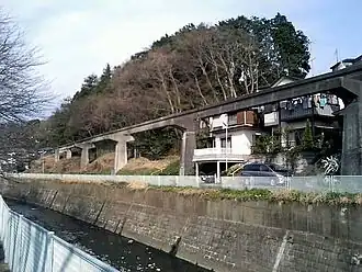However, cracks soon started appearing in the monorail beam.[1] The developers had been unable to buy the necessary land along the original route, forcing the route of the monorail to be changed, resulting in steep grades of as much as 100‰ (10%). The monorail vehicles were altered to cope with the high grades, increasing their weight, but the strength of the beam was not increased to match. It soon became clear that the beam was simply not strong enough to withstand these additional stresses safely, and in September 1967, the service was suspended[7] after a strong demand from the Ministry of Land, Infrastructure, Transport and Tourism[5] despite operating for only a year and four months.[1]