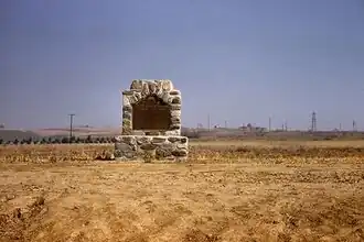 The site of the hacienda is registered by the state as California Historical Landmark #226.[1] A stone marker, placed by the California Centennials Commission and dedicated 3 May 1950, has a bronze plaque titled "Site of Don Bernardo Yorba Hacienda" which gives a brief summary of the historical background of the site. The marker faces south and is located on the northeast corner of Esperanza Road and Echo Hill Lane in Yorba Linda, at the entrance to the Fairmont Hill community. According to the plaque, the base was furnished by the Placentia Round Table Club and supposedly contains some of the original adobe bricks from the hacienda structure[15] salvaged from the barranca where it was dumped. There are a few red bricks found on the backside, but most of the base seems to be made of large stones cemented together. The site marker is actually 55 yards northeast from the east wall of the original main structure. Based on survey reports registered with the county, the true site of this structure is parallel with the road in what is now the westbound fast lane of Esperanza road on the north side of the center divider, midway along the left turn lane opposite Echo Hill Lane.[16]