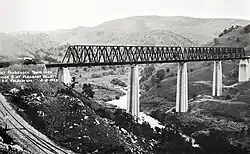 The entire roadbed for the Yosemite Valley Railroad was blasted out of solid rock, which required approximately 3,000,000 pounds of dynamite and powder and 285 miles of fuse. Three Howe truss bridges were built to cross the canyon's steep walls, located at Hopeton, Pleasant Valley, and Bagby, with a total of 65 smaller bridges and trestles along the route. The completed route had 63.5 miles of grades and 32.9 miles of curves with a maximum grade of 1-2%.[13] The main line had Bessemer rail weighing 70 pounds to the yard, and there were 505 curves, as well as 10,265 miles of yards and sidings.[3]: 15–16 A telephone and telegraph line was constructed along the route and completed on July 1, 1907, connecting Yosemite with the outside world.[14]
