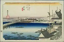 The classic ukiyo-e print by Andō Hiroshige (Hōeidō edition) from 1831–1834 depicts the famous bridge at Yoshida, as well as Yoshida Castle.[2]