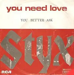 "You Need Love" is a song by Styx written by Dennis DeYoung.[2] Following the success of the 1974 re-release of the single "Lady" from the album Styx II, "You Need Love" from that album was released as a follow-up single.[3]
