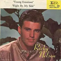 "Young Emotions" is a song written by Jerry Livingston and Mack David and performed by Ricky Nelson. The song reached No. 12 on the Billboard Hot 100, No. 28 on the R&B chart, and No. 48 on the UK Singles Chart in 1960.[1] The single's B-side, "Right by My Side", reached No. 59 on the Billboard Hot 100.[2]