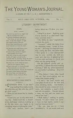 The Young Woman's Journal was founded in 1889 by Susa Young Gates, a volunteer worker within the YLMIA, with its first issue dated October of that year.[1][2] Anstis Elmina Shepard Taylor, the YLMIA general president at the time, oversaw the first publication of the journal.[2] The periodical was unique for the time period, because of its target of a "young woman" audience.[3]