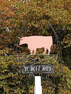 The name 'Yoxford' comes from Old English geoc-ford meaning "yoke ford", probably indicating that the ford was wide enough for a yoke of oxen to pass through.[2]