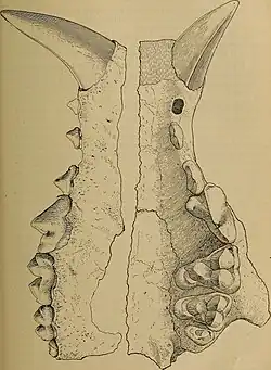 Originally described as "Amphicyon" tolosanus by Noulet in 1876, this is the oldest known species of Ysengrinia, known from the terminal Oligocene to early Miocene of France and Germany. A fossil discovered at Flörsheim described as Amphicyon robustum by Weitzel in 1930 was shown by Kuss to belong to the same species.[2] It is known by two mandibular fragments, one including p4-m2 from Le Cammas (probably dating to MP 30), and one from another with p3-m2 from Flörsheim (MP 30 or MN 2), as well as an isolated lower molar from Paulhiac (MN1), and the fragment of canine and a right humerus from Dieupentale (MP29-30).[14] Hunt notes that Y. tolosana shares more characteristics with Y. americana than the other European species do.[1][12][15] It is similar to Y. gerandiana in size, with an estimated mass of roughly 100 kg, but with a much wider second upper molar.[16][12]
