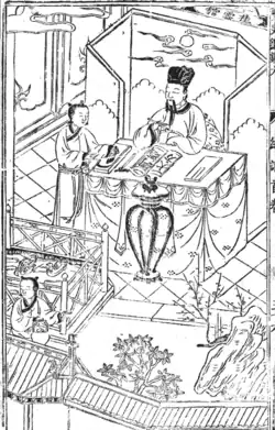 In addition, Yu enjoyed including illustrations of himself in his publications.[8] While many authors at the time were known to include their portraits in their books, it was "extremely rare" for commercial publishers to follow suit.[9] One of the earliest surviving portraits of Yu—depicting him in front of one of his printing houses, Santai guan (三台館) or Triple-Terraced House—can be found on the cover page of his 1598 anthology of vernacular love stories, titled Xinke Xinke yunchuang huishuang Wanjin qinglin (新刻芸窓彙爽萬錦情林).[e][10]