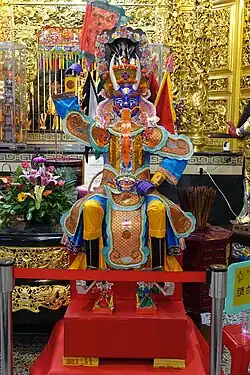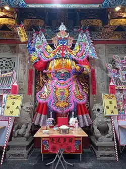 After the opening eulogies, the participants, consisting of the main celebrant(s), the assisting monastics, the patron(s) and other participants then proceed to a second altar known as the Mianran Altar (Chinese: 面燃壇; pinyin: Miànrán Tǎn), which enshrines the deity known as Mianran Dashi (Chinese: 面燃大士; pinyin: Miànrán Dàshì; lit "Burning-Face Mahāsattva"), a ghost king who is regarded as a manifestation of Guanyin. At this altar, the participants chant homages to Mianran Dashi and recite various sūtras and dhāraṇīs, including the Heart Sūtra and the Amitābha Pure Land Rebirth Mantra. Verses regarding transfer of merit as well as cadences paying homage to the Buddha Amitābha (Chinese: 阿彌陀佛; pinyin: Āmítuó Fó) are also sung.[24]