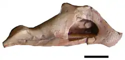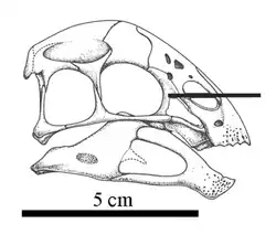 The describing authors established some diagnostic traits. The front upper corner of the fenestra antorbitalis and the rear upper corner of the bony nostril are positioned at about the same height. The premaxilla shows a distinctive opening below and in front of the nostril. The rear upper process of the premaxilla touches the upper rim of the fenestra antorbitalis but not the front process of the lacrimal; the nasal bone separates both bones.The parietal approaches the frontal bone in length. At the fourth and fifth neck vertebrae, the rear edge of the vertebral centrum forms a straight line between the postzygapophyses. The thigh bone is longer than the ilium.[1]