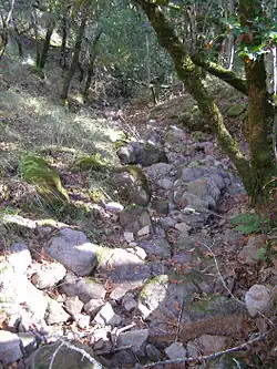 The Yulupa Creek watershed was below the Pacific Ocean floor as recently as the Miocene era, around which time massive uplift and volcanic action formed the massif which comprises the headwaters higher elevations of the watershed of today. Elevations within the drainage basin of Yulupa Creek range from about 430 to 1,800 feet (130 to 550 meters) above sea level. Sandstone is the dominant rock type, as a remnant of the ancient sea floor. Slopes within the headwaters area commonly range from 15 to 30 percent, and lower reaches have gradients of two to five percent. One of the major soil associations within the upper elevation riparian zone is Goulding cobbly clay loam, which contains roughly 25 percent cobblestones, as well as some basaltic exposures, betraying the volcanic past of the Sonoma Mountains formation.[8] Typical soil depths in the headwater area range from 14 to 20 inches (36 to 51 centimeters). Much of the soil type in the Yulupa Creek riparian zone consists of Laniger loam, with rhyolite outcrops, another relic of the igneous history.