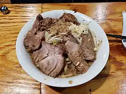 The restaurant only offers one dish: a bowl of ramen either in regular or “extra pork” (buta) sizes which vary based on the amount of chāshū, served alongside cabbage and bean sprouts, as well as options for extra fat and garlic.[3] The ramen base is made from a tonkotsu broth that cooks for 14 hours, giving it a rich flavor, combined with a shōyu broth and hand-cut noodles.[2] The dish itself has been described by The Boston Globe as being "porky, garlicky, hefty, [and] intense",[8] with prospective diners waiting in line for it every day,[2] sometimes for over an hour.[1] There is a vegetarian option as well.