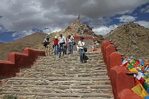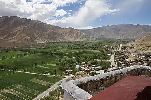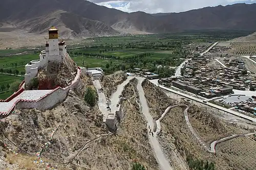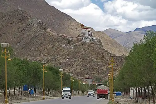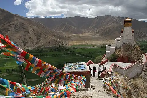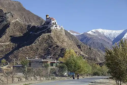 Yumbulagang stands on a hill at a bend along the Yarlung Tsampo River, on the eastern bank of the Yarlung Valley of southeast Lhokha, about 192 kilometres (119 mi) southeast of Lhasa and 9 kilometres (5.6 mi) south of Tsetang.[3] The palace and its shrine were demolished during the 1966-1976 Cultural Revolution, and the palace has been partially rebuilt.
