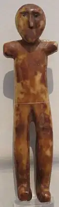 Both Yup'ik, Siberian Yupik, and Iñupiaq dolls are also known as Eskimo doll in Alaska.[4] It is possible to distinguish Yup'ik human figurines from Iñupiaq examples on the basis of facial features. Yup'ik figurines have a distinct brow line, shaped like two crescents joined at the center by the nose, whereas Iñupiaq figurines lack this brow line and have more pronounced noses and tiny eyes that look as through they had been poked in by the tip of a pencil or pen. The mouth of Yup'ik figurines mirror the crescent shape of the brows, whereas the Inupiaq dolls have small, straight mouths. Overall, the features of the Iñupiaq examples are crudely carved.[2]