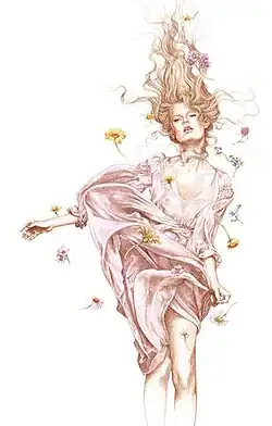 In the 1970s, Gilbert provided front-cover illustrations for the Penguin Books edition of the works of D. H. Lawrence.[9] In 2004, The Journal reported that Gilbert "has progressed to become one of the best selling British illustrators in the USA, well known for the fairytale quality of her work seen mostly in children's books."[10] Gilbert compiled 16 traditional lullabies into her 1991 book, Baby's Book of Lullabies & Cradle Songs, which she illustrated using watercolours. The selections included songs in English, French, and Norwegian, among other languages.[11][12] She illustrated Rebecca Hickox's children's book, Per and the Dala Horse in 1997,[13] and M.C. Helldorfer's Night of the White Stag in 1999.[14] Gilbert has provided artwork for many other children's books, including A Visit from St. Nicholas,[15] and Vivien French's A Christmas Star Called Hannah, both published in 2000.[16] She illustrated Billy Joel's first children's book, "Goodbye My Angel", in 2004, which he based on a song he wrote for his daughter.[17] Publishers Weekly opined that Gilbert's "idealized images of the long-lashed heroine and luminous landscapes echo the unabashedly sentimental strains of Joel's song."[18]