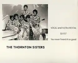 Two years later, the sextet went on to win an unprecedented six consecutive weeks on Amateur Night at Harlem's world famous Apollo Theatre.[11] The coveted prize was a paid week of appearances with professional artists, such as Shep and the Limelites, Fats Domino, and Ernie K-Doe. A year later, in 1962, The Thornton Sisters were featured at The Brooklyn Fox with Murray the "K" and his Swingin' Soiree, performing with Fabian, The Shirelles, Chuck Jackson, and The Four Seasons.[12] During that year, The Thornton Sisters signed with Roulette Records and then Atlantic Records. However, the mandated personal appearance tours conflicted with their academic pursuits and the contracts were canceled. In 1965, The Thornton Sisters recorded "Watch Your Step" (written by Jeanette Thornton) and "Big City Boy" on the BobSan label.