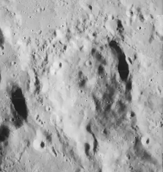 Zöllner is a lunar impact crater located to the west of Sinus Asperitatis. It was named after German astrophysicist and astronomer Johann Karl Friedrich Zöllner.[1] To the north is the smaller crater Alfraganus and to the northwest lies the oval-shaped Taylor. Southeast of Zöllner is the smaller crater Kant.