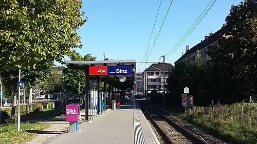 Zürich Binz (German: Zürich Binz) is a railway station in the west of the Swiss city of Zurich, in the city's Alt-Wiedikon quarter. It is located within fare zone 110 of the Zürcher Verkehrsverbund (ZVV).[2] The station is on the Uetliberg line, which is owned and operated by the Sihltal Zürich Uetliberg Bahn (SZU).[3][4][5]