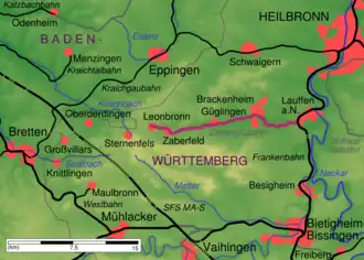 The Zabergäu Railway (Zabergäubahn) was a spur line from the Franconia Railway. It ran for 20.3 km from Lauffen am Neckar to Leonbronn through an area known as the Zabergäu. Originally built with narrow gauge, it was converted to standard gauge in the 1960s.