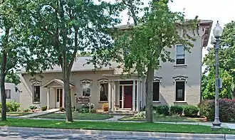 The Zalmon Church House is a two-story painted brick Italianate structure. It has a hipped roof with a single-story gabled wing. It has paired eaves brackets and segmental-arched lintels which are typical Italianate details. A front porch and small side porch are of more recent construction, but complement the architecture.[2]