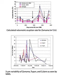 Galileo's NIMS instrument collected data on volcanic emissions to analyze the power output. A two-temperature model is used to determine the temperature and power output. Models have shown that Zamama has a temperature of 1,173 ± 243 K (900 ± 243 °C; 1,652 ± 437 °F). Pyroclastic flows with high silica content can have temperatures as high as 1,200 °C (1,470 K; 2,190 °F). Since Zamama volcanoes have such high temperatures, this indicates siliceous magma. No actual samples of Zamama's magma have been retrieved and processed for composition.[9]