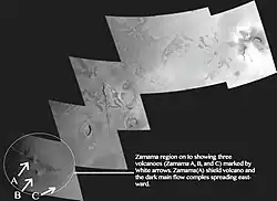 Zamama is an active volcanic center on Jupiter's moon Io.[1][2] This volcanic center erupted after the Voyager 1 flyby in 1979, making it one of the few planetary volcanoes known to have activated during this generation's lifetime. Further analysis and study by the Galileo spacecraft helped with the overall study of Io's volcanism. Galileo located it on Io at 21°N 173°W / 21°N 173°W[1][3]. Zamama has a fissure-fed-type flow that is 150 km (93 mi) long with temperatures of 1,100 K (830 °C; 1,520 °F),[1] and the volcanic center site has explosive and effusive eruption characteristics.[4] The flow appears to be emanating from the Promethean-type volcano.