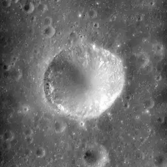 Zasyadko is a small lunar impact crater located to the northeast of Mare Smythii. It was named by the IAU in 1976.[1] It lies beyond the eastern lunar limb in an area that is only visible from Earth during favorable librations. It is located entirely within the crater Babcock. To the southwest is McAdie. Zasyadko is a bowl-shaped formation with a relatively small interior floor. It is not significantly eroded along the rim.