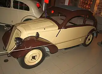 Designed as a smaller complement to the Zbrojovka Z 4, the Z 6 Hurvínek was a two-door sedan of conventional front-engine, front-wheel-drive layout.[1] The production car used a liquid-cooled two stroke two cylinder 735 cc (44.9 in3) engine with a bore of 90 mm (3+1⁄2 in) and stroke of 77 mm (3 in).[2]